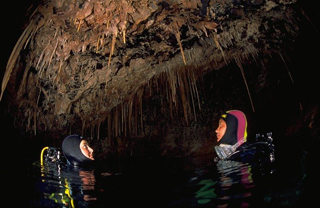 The highest part of the cave is above sea level. It is about 2 m (6.5 ft) high and 4 m (13 ft) wide and forms a dome shape that is almost covered with stalactites that here and there reach right down to caress the surface of the water. The air is perfectly breathable and you can take off your mask for a better view of the evocative scenery.